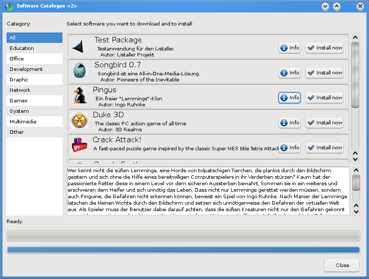 Aktuell entwickle ich Version 0.1.18a des Listallers. Diese erste Alpha-Version enthält einen viel stabileren installer, bessere Zusammenarbeit mit den Paketmanagement-systemen der verschiedenen Distributionen und einen Software-Katalog.