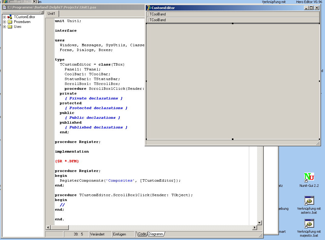 Auf dem Bild siehst du eine Box die eine neue Klasse TCustomEditor deklariert, da hab ich schonmal eine ToolBar für die Bedienung draufgesetzt. Zusätzlich eine ScrollBox. Jetzt könnte man stickum weiter Buttons deklarieren, die passenden Icons zuweisen und deren Funkionaltät im Quellcode verankern. Und das indem man einfach das Onklick-Ereignis wie gewohnt für den Button anklickt und schon kann man den Quellcode erstellen.