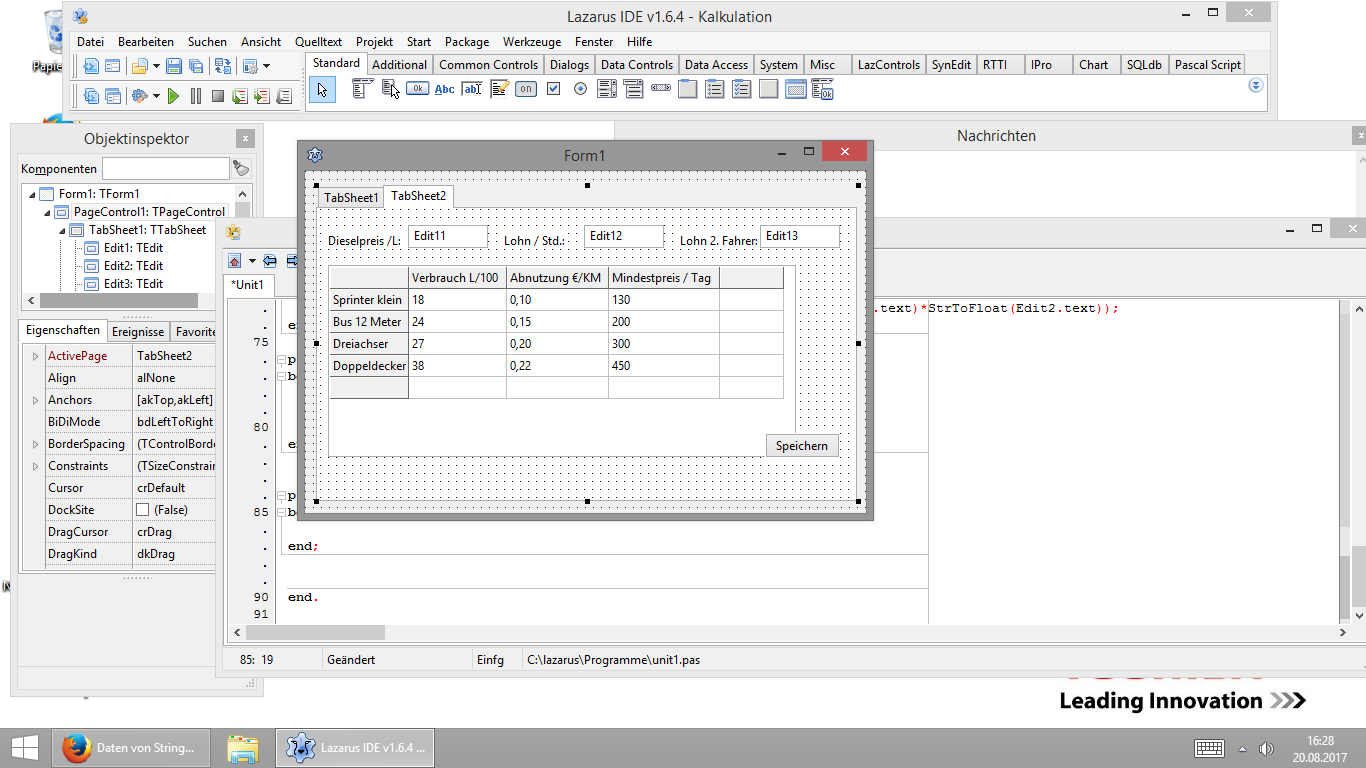 Ich habe einen kleinen 5*6 StringGrid mit Einträgen erstellt und diese möchte ich nun in eine Combobox übernehmen, um mit dem wiederrum ausgewählten Datensatz eine weitere Berechnung (int) zu machen. Programmcode ist noch nichts wesentliches vorhanden.