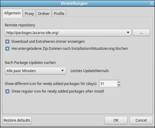 Wenn du im OPM auf "Options" gehst, erscheint die URL zum Remote Repository. Steht da "http://packages.lazarus-ide.de"? Als "Connection Timeout" sind bei mir 10 s eingetragen. Ggfs. "Restore defaults" klicken. Im Fall eines Proxy müssen die entsprechenden Angaben auf der Seite "Proxy" gemacht werden.