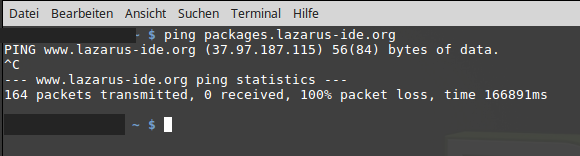 So, jetzt habe versucht die packages.lazarus-ide.org an zu pingen. Nach gefühlten 2 Minuten habe ich mit Strg C abgebrochen.