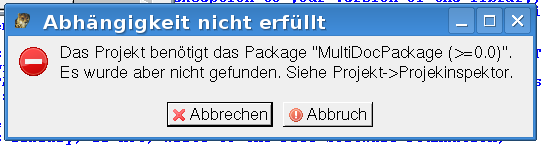 An der Übersetzung liegt es meiner Meinung nach nicht - denn im Englischen liegen Abort und Cancel auch sehr nahe in der Bedeutung. Vielleicht würde eine einzige Schaltfläche mit einem "OK" ausreichen, denn eine Auswahlmöglichkeit macht hier keinen Sinn - wenn das Package fehlt, dann fehlt es.knight hat geschrieben:Im englischen hast du die Wahl zwischen Cancel und Abort. Wenn du eine bessere Übersetzung hast dann her damit.