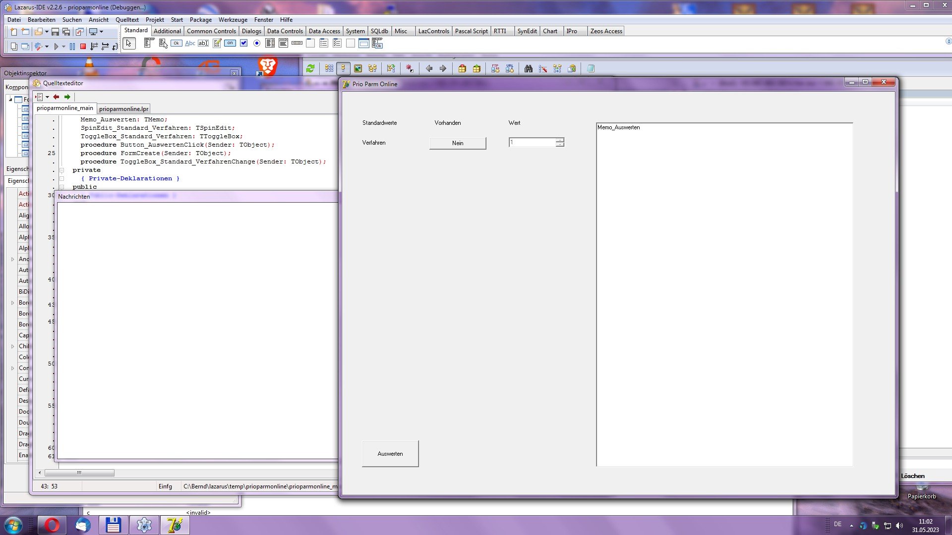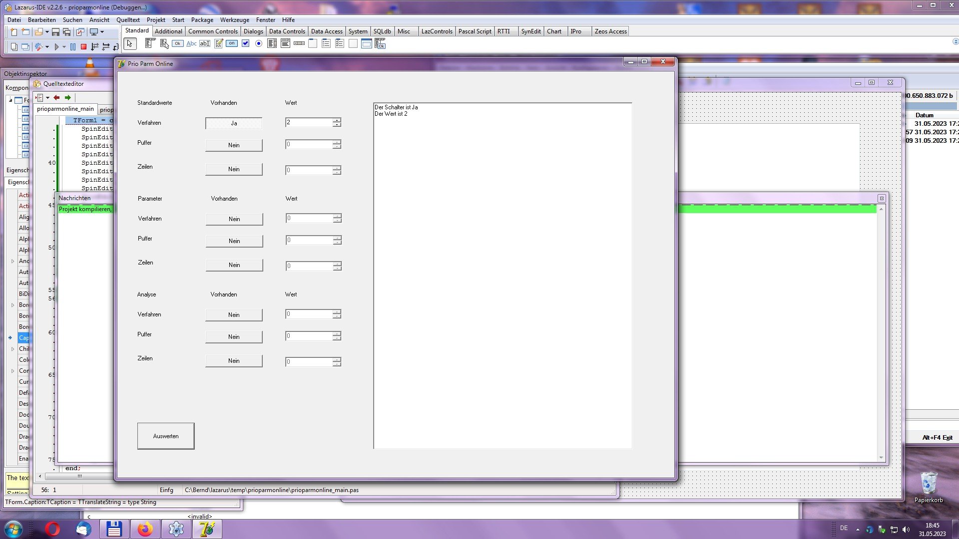 Wenn ich den Button drücke, sagt mir das Memo, ob der Toggle ja oder nein zeigt und welchen Wert der SpinEdit hat.