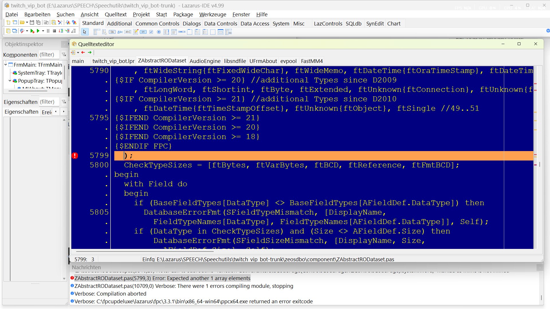 FPC trunk (3.3.1) unterstützt mehr Datentypen als die stabile Version (3.2.2). Laut der Meldung fehlt in der Zeos-Array-Deklaration ein Datentyp, der in der DB-Unit definiert ist. Sie müssen diesen Datentyp vergleichen und in der ZAbstractRODataset-Datei hinzufügen.