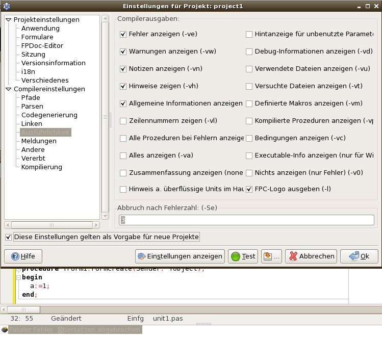Lazarus zeigt Compilermeldungen (Fehlermeldungen) zeigt bei meiner Linux installation nicht ausführlich. Er zeigt z.b. nicht wie unter Windows so und so Fehler bei Zeile x,y...