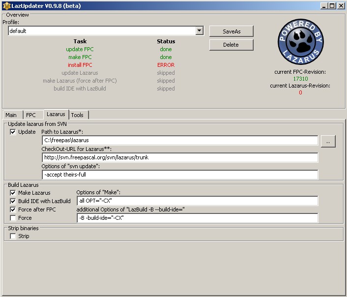 HAbe ich gemacht, aber LazUpdate läuft nicht durch:shokwave hat geschrieben: und du musst unter "Werkzeuge" bei "FPC-Binärdatei" den heruntergeladenen (und entpackten!) Compiler (X:\Pafd\zu\ppc386.exe) eintragen/auswählen.