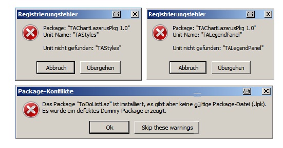 Die dritte Meldung deutet darauf hin, daß eine frühere Lazarus-Version nicht sauber deinstalliert wurde. Ich würde daher Lazarus einmal komplett deinstallieren (inklusive der Einstellungen im Benutzerverzeichnis) und es anschließend neu installieren. Möglicherweise wirst du so auch die anderen Meldungen los.