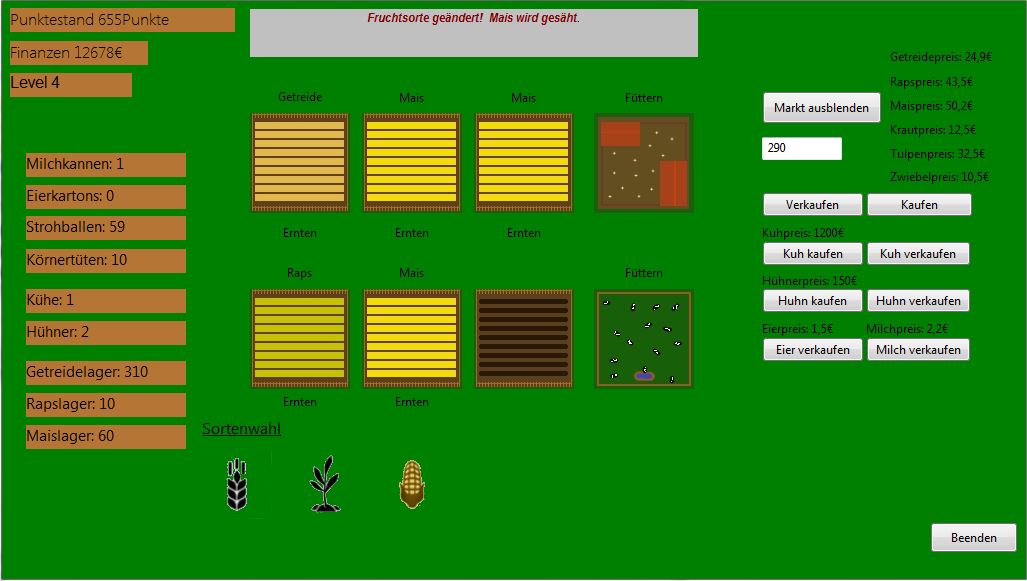 Mit dem Button rechts wird der Markt aktiviert. Dort können die Erzeugnisse verkauft werden.